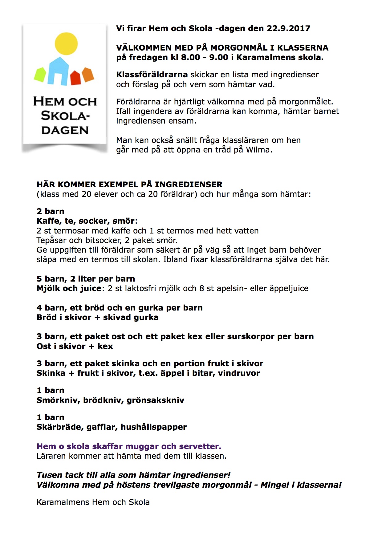 Nationella Hem och Skola -dagen firades i Karamalmen med morgonmål i klasserna den 25.9.2015. Klicka på bilden för att se morgonmålinstruktionerna.